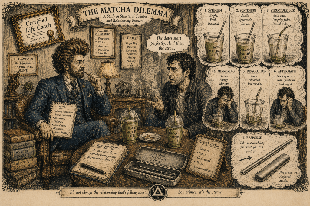 “At first it was charming,” he said. “Endearing, even. A signature move. ‘Let’s get matcha,’ she’d say. And I’d think—yes. This is culture. This is antioxidants. This is a man evolving.”