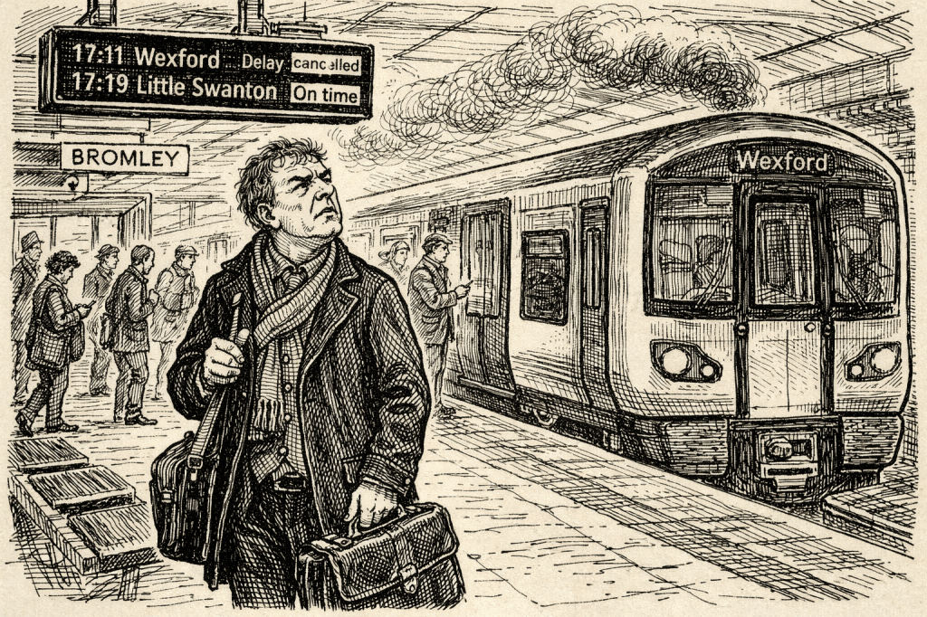 After forty minutes of stopping and starting the train finally arrived at Biggington and George ambled onto the platform to the sound of “All change please. This train terminates here.”