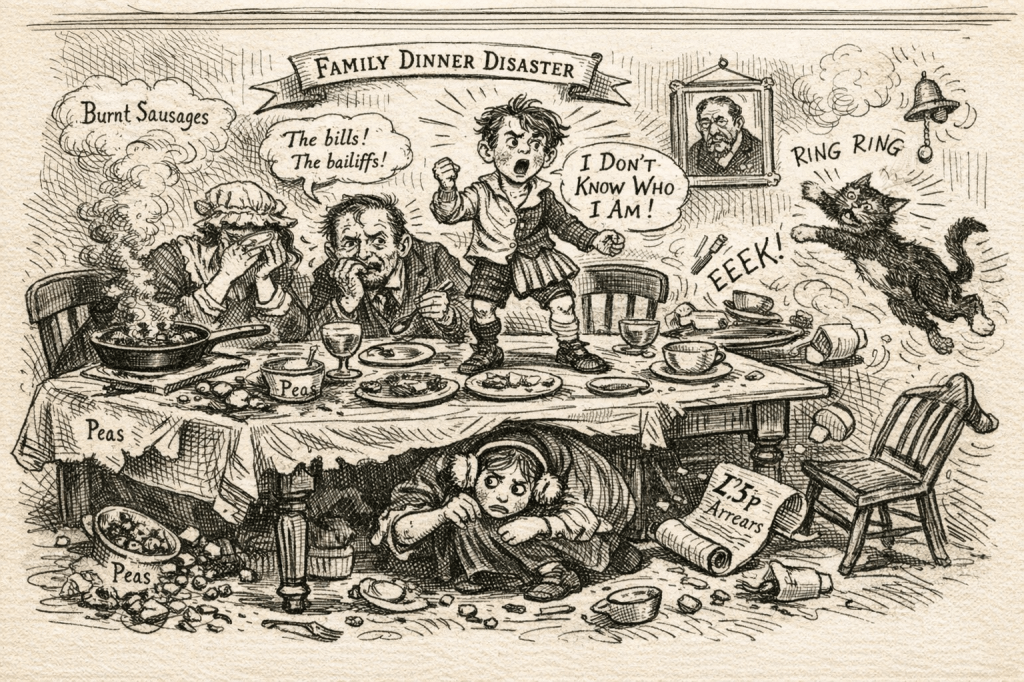 Tim swept peas from the floor. Sarah sobbed into a burnt sausage.