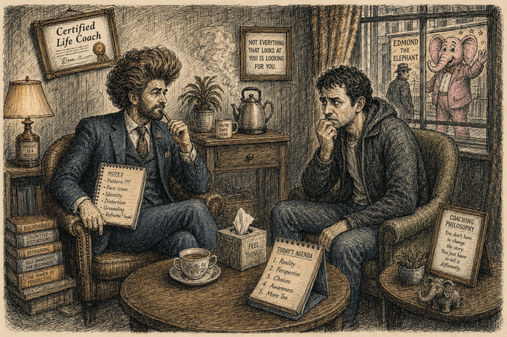I make a point of introducing myself as a certified life coach before Arman even sits down, because in my experience the certification does most of the work. It hangs there on the wall behind me, framed, slightly crooked, like a quiet promise that whatever is wrong with a person can be reworded into something manageable.